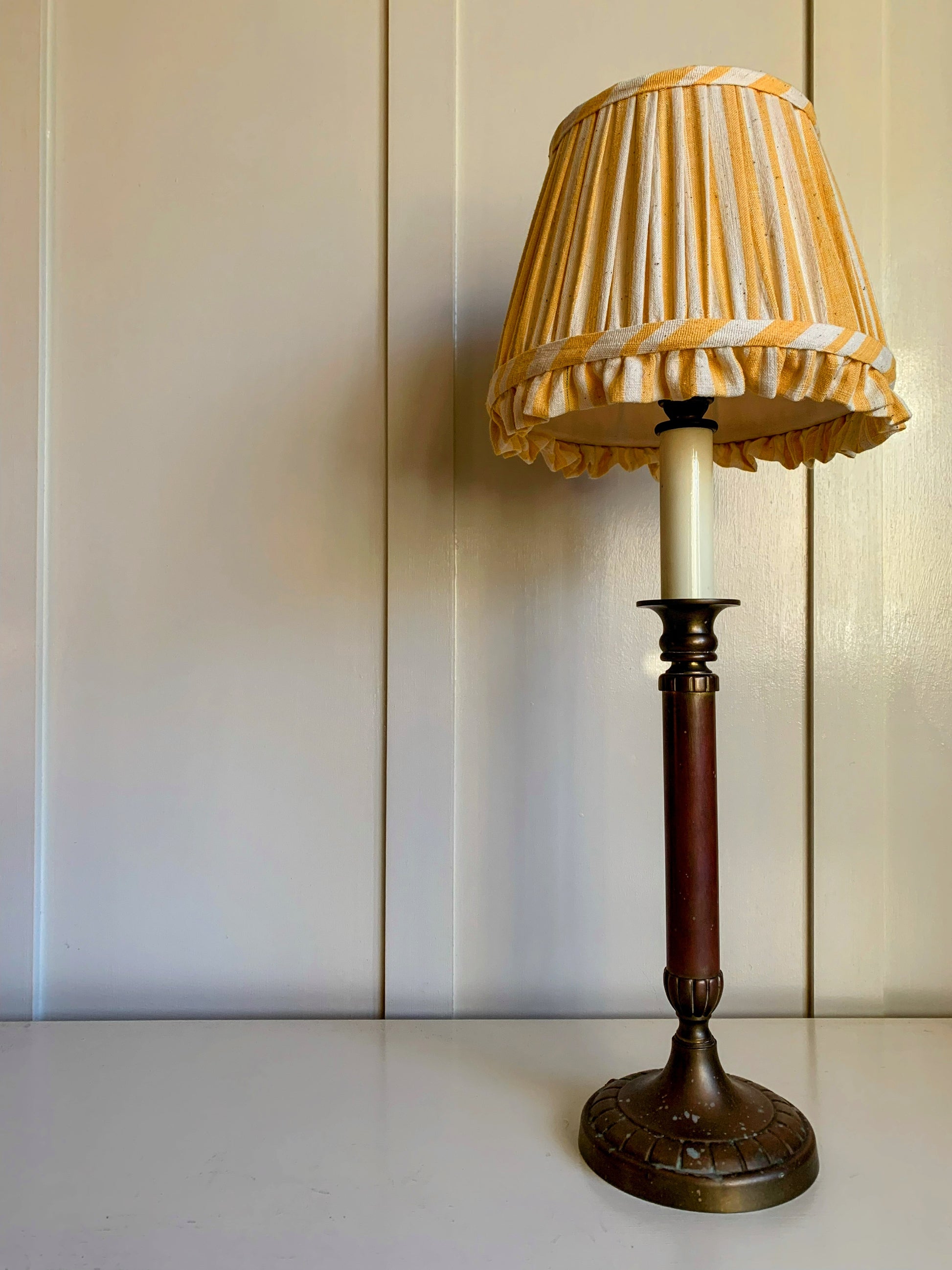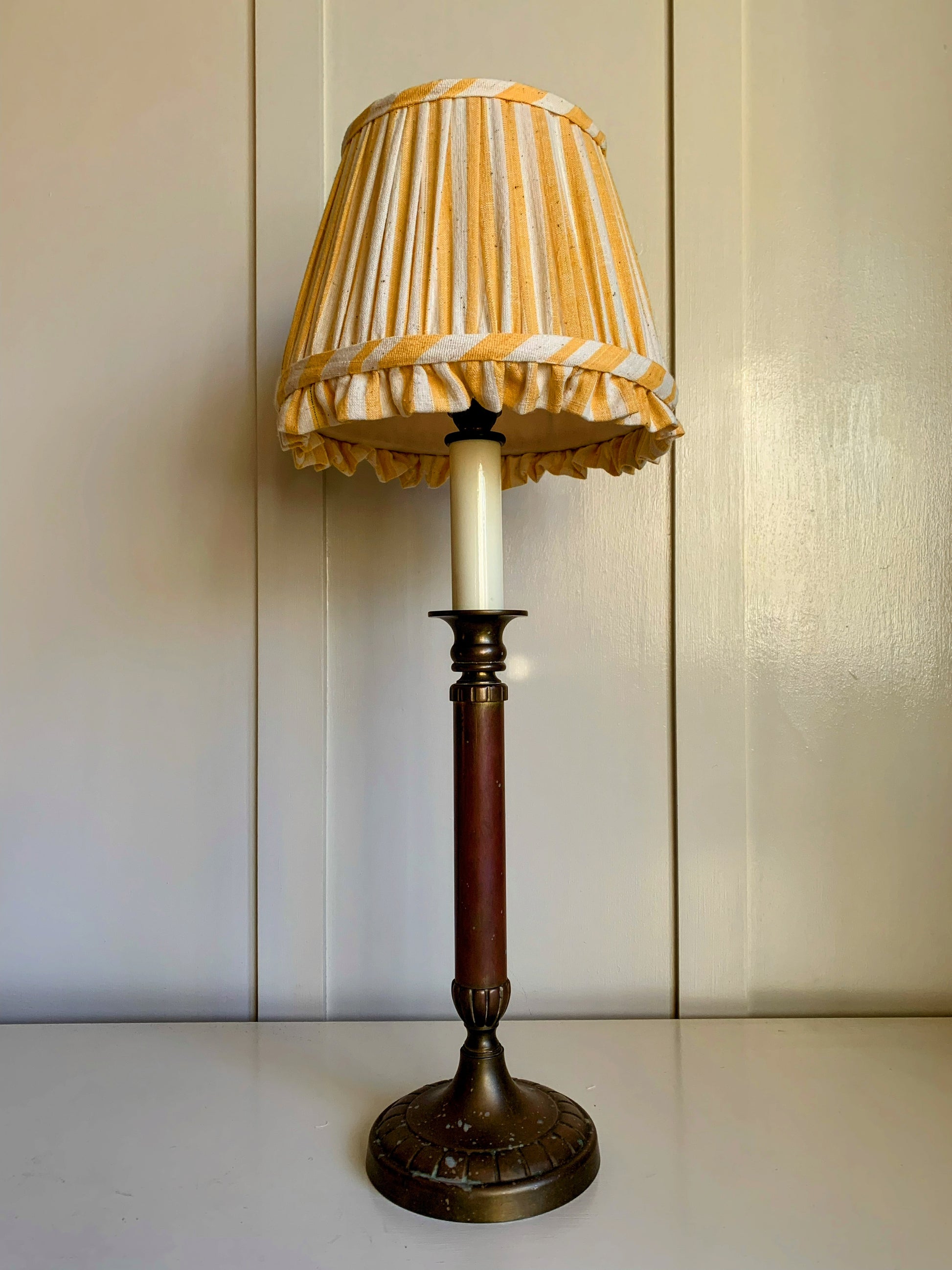 Handsewn with a beautiful Indian striped slub cotton & lined in off white. Finished with a matching ruffle and handmade trim.